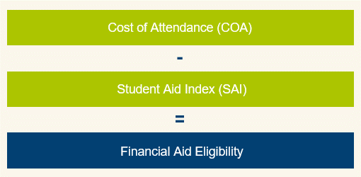 When a student submits a FAFSA, every college that receives the application will input the student’s FAFSA data into the SAI calculation (called federal methodology) to generate an SAI for that student. The school will then subtract the student’s SAI from the college cost (called the Cost of Attendance (COA)) to determine the student’s eligibility for financial aid.