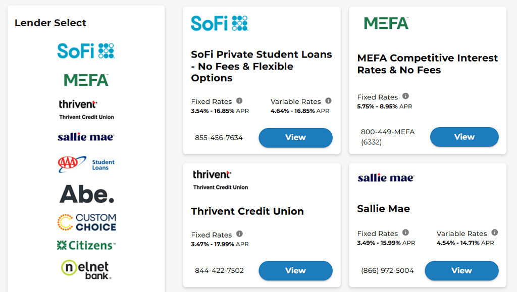 You are then presented with the list of loan options from lenders your school has selected. Your school may have chosen lenders for this list based on researching the best options for students or adding a list of lenders historically chosen by students at the school. It will likely not be an exhaustive list of all the options available to you, and you can choose to borrow with a lender not on the list if you find it to have more favorable terms for you.