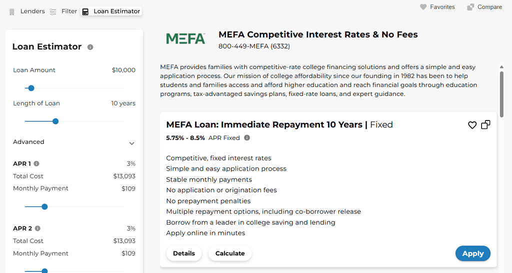 This screen is a good place to compare the interest rates. Pay attention to the entire range of interest rates, not just the lowest rate listed. Most families end up with a loan somewhere in the mid-range of the interest rates. The lowest interest rates are often only available to borrowers with the very best credit. If you want to delve deeper into the details of each loan, you may click on the View button to be brought to the page for that specific lender.