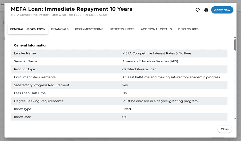 Also on the lender page you can select Details to see a lot more information about the loan, including degree and enrollment requirements, Satisfactory Academic Progress requirements, fees, loan benefits, repayment terms, and disclosure statements.